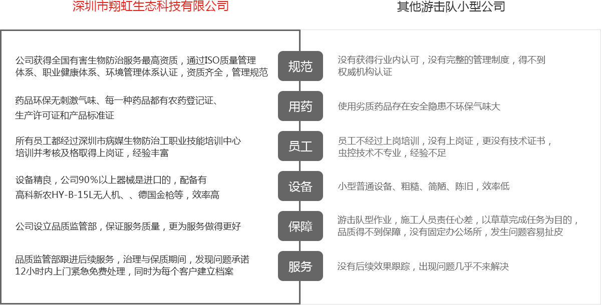 我司專業從事蟲害消殺業務,獲得全國有害生物防制服務機構資質A級證書,廣東省有害生物防制A級資質,深圳市除蟲滅鼠服務資格甲級證書,深圳市白蟻防治甲級資質證書。通過ISO9001質量管理體系認證, OHSMS18001職業健康管理體系認證, ISO14001環境管理體系認證。